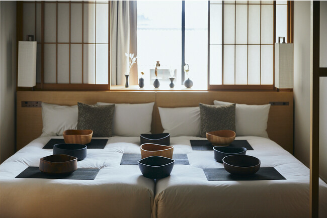 客室は、京都の伝統的な住宅形式の町家をモダンに表現した、細長い"マチヤスタイル"のデザインが特徴です。