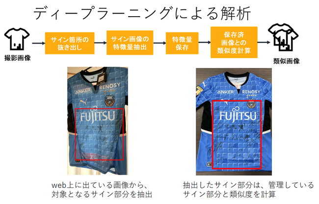判定方法:取り込んだ画像からサイン部分を検出し、データベース上から類似度が高い画像を10枚特定。サイン入りユニフォームを使った実証実験の結果では、正解率97%。