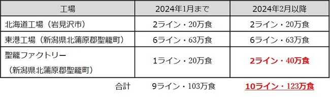 これにより、聖籠ファクトリーの生産ラインは現在の1ラインから2ラインに増加し、当社の米飯ライン数は9ラインから10ライン体制となり、「サトウのごはん」の生産能力は、現在の日産約103万食から123 万食へ大幅に伸長いたします。(年間では4億食体制)