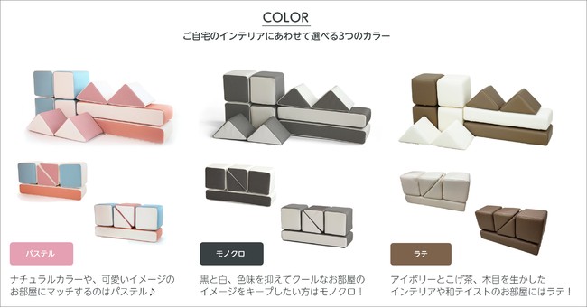 同時発売の「PLAYクッション+」、騒音を吸収する「PLAYマット+」(4月中旬発売予定)と合わせれば、遊びの幅もますます広がります。カラーはこれまでの「パステル」、「ラテ」に加え、シックでお洒落な「モノクロ」が新登場。