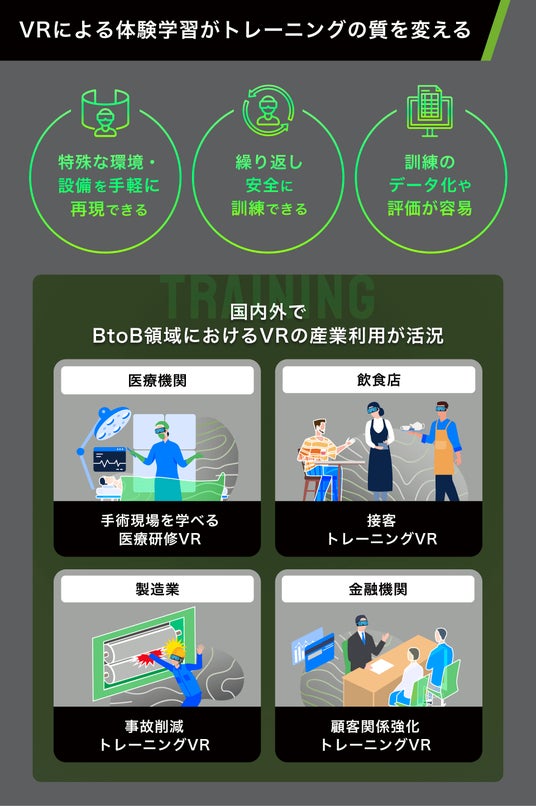 XR技術の急速な進歩により、これまで行われていた人材育成トレーニングが機材の用意や場所、訓練相手など物理的な制約を受けることのない仮想環境で行えるようになりました。再現が難しい危険な状況を疑似体験する安全体感教育も可能となり、さまざまな産業でのトレーニング方法の変革を目指しています。