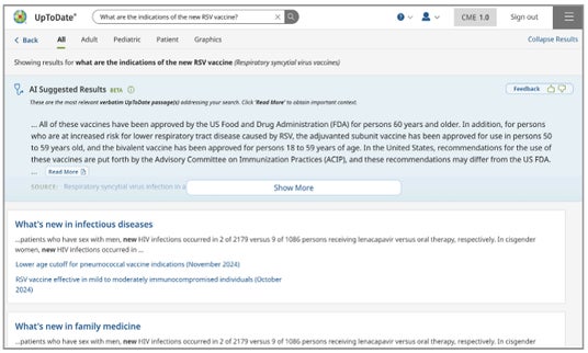 画像:新しいAI搭載の臨床トピック検索機能では、医師が自然な言葉や複数のキーワードを使って質問すると、関連するUpToDateのトピックが正確に表示されるようになりました。