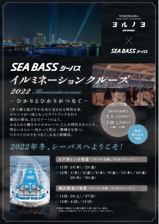 横浜港の素敵な景色を見ながらクルーズを楽しめるシーバスとヨルノヨがコラボレーションし、期間限定でヨルノヨ特別便「イルミネーションクルーズ」を運航します。このクルーズでは、暖房完備の温かい船内から、ヨルノヨが行う光と音楽の演出「NIGHT VIEWING」をガイドの解説付きで見ることができます。また、「NIGHT VIEWING」鑑賞時は、会場で流れる音楽が船内でも流れます。