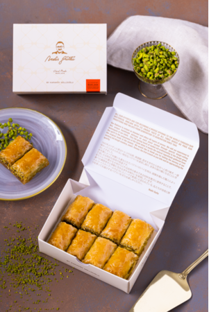 薄いパイ生地を手作業で幾層にも重ね、砕いたピスタチオやくるみをたっぷり挟み焼き上げ、甘いバターシロップをかけて仕上げたトルコの伝統菓子です。