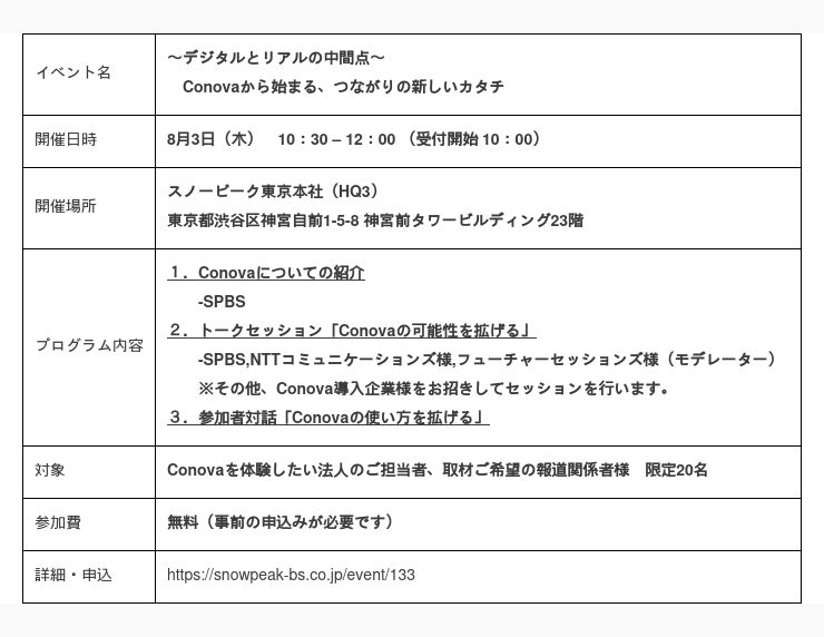 株式会社スノーピーク(代表取締役 会長兼社長執行役員 :山井太、本社:新潟県三条市、証券コード: 7816 )の子会社である株式会社スノーピークビジネスソリューションズ(愛知県岡崎市 代表取締役:村瀬 亮、以下 SPBS )は、映像と音声で拠点間をつなぐコミュニケーションツール「INTERACTIVISION(R)(インタラクティビジョン)」をリブランドし、名称を新たに「Conova(R)(コノバ)」として提供を開始いたしました。