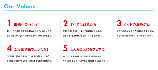 パーパスの策定に当たり、カルチャーデザインファームKESIKIの伴走のもと、デザインアプローチ(※)を活用しながら進めました。「JDP職員全員で、思いを共有する、言葉を紡ぐ」「個人の「やりたい」と組織の「やるべき」の交差点を紡ぐ」「現状否定ではなく、肯定から始める」の三つの視点を意識し、一部の職員だけでつくるのではなく、全職員が自分ごと化できるものとして取り組みました。今回、職員の対話をもとに、五つの行動指針をつくりました。守ってきた組織文化の良いところを生かしながら、新たな挑戦に向けて私たち自身が創造性を発揮し、多様性を尊重して、コラボレーションを生み出していきます。