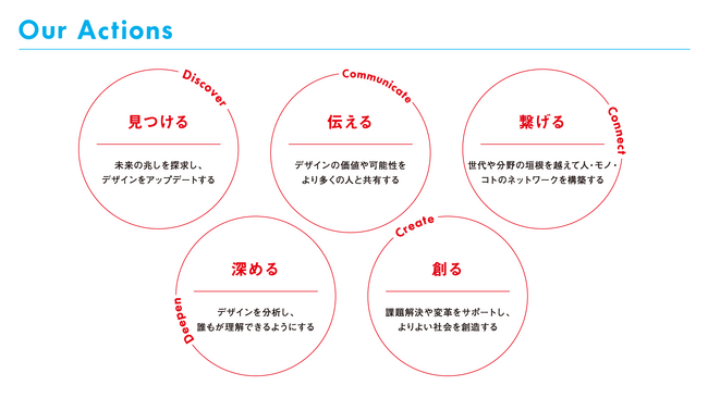 これまで以上に「よいデザイン」に向き合い、日本のデザインの可能性を拡げるだけでなくデザインの力をあらゆる人に手渡すことで、一人でも多くの人が創造性を発揮して豊かな社会をつくっていく。そのような社会をつくる意思表明として、パーパスおよび、それに伴う事業指針・行動指針を策定しました。