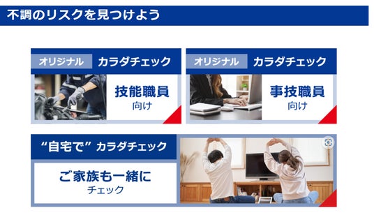 また、従業員の皆さんが日頃から身体の状態を把握し、不調に繋がるリスクを測り、改善に導くオリジナルのカラダチェックも活用でき、健康経営の更なる促進に役立ちます。