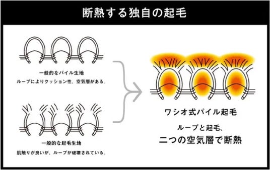 特許取得実績もある独自の技術を使った起毛素材は抜群の保温力を誇ります