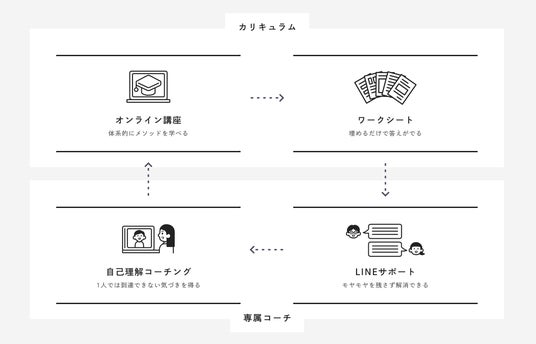 自己理解プログラムとは「やりたいこと探しを終わらせる」をコンセプトとした、3ヶ月10STEPのコーチングプログラムです。自己理解メソッドに基づいたワークとコーチングセッションに加え、LINEでのサポートも充実しているため、3ヶ月で「やりたいこと探し」を終わらせることができます。