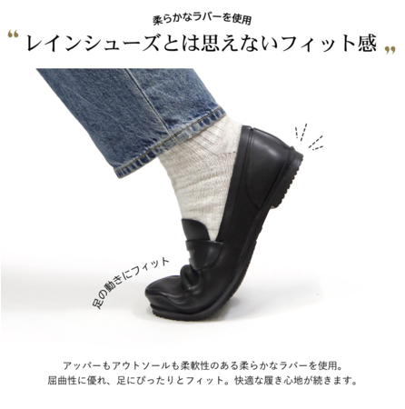 雨対応のラバーシューズに見られがちな厚みのあるゴムを使用せず、革のように柔軟性のあるゴムを使用しているため足にピッタリフィットする仕様になっております。