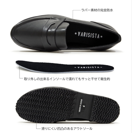 雨が降っていなくても違和感の無いように作られ、日本人の甲に合わせた深さや横から見た時に綺麗に見えるように作られた美しいデザインだけでなく、濡れても洗ったり干せたり出来るよう取り外し可能にしたインソールや、雨や雪など足元が滑りやすい路面でもしっかりとグリップ力を保ってくれる凸凹のアウトソールを使用するなど機能性も十分な万能の1足です。