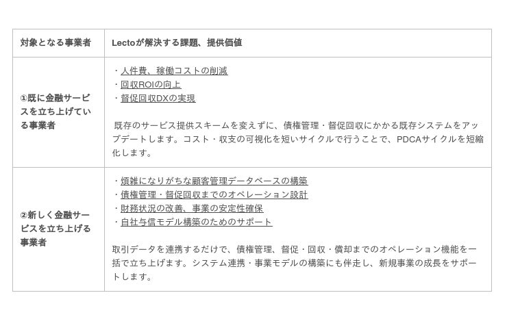 Lectoの関与によってそもそもの未収幅を縮減していくことを原則としつつ、新しいオフバランスのための手段を提供することで、顧客企業の収益性をより一層高めることに貢献してまいります。