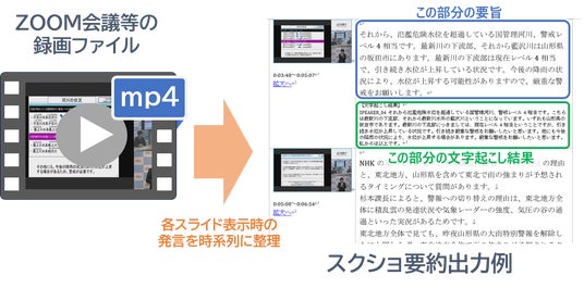 ZoomなどのTV会議を録画したmp4ファイルを投入すると、音声認識による文字起こしやAI要約結果に加え、スライド画面のスクリーンショットと発言内容を対応表示させた議事録を自動生成します。