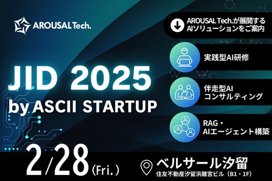 アローサル・テクノロジー株式会社(本社:東京都港区、代表:佐藤拓哉)は、2025年2月28日(金)にASCII STARTUPが主催にて開催されるイノベーションに関わるすべての人をつなぐ、日本の産業を革新するための祭典「JID2025 by ASCII STARTUP」へ出展いたします。