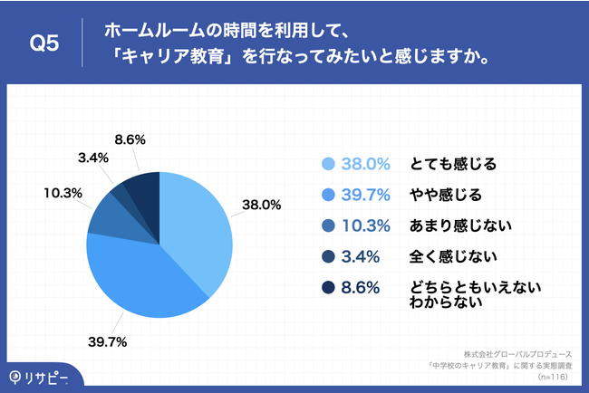 「Q5.ホームルームの時間を利用して、「キャリア教育」を行なってみたいと感じますか。」(n=116)と質問したところ、「とても感じる」が38.0%、「やや感じる」が39.7%という回答となりました。