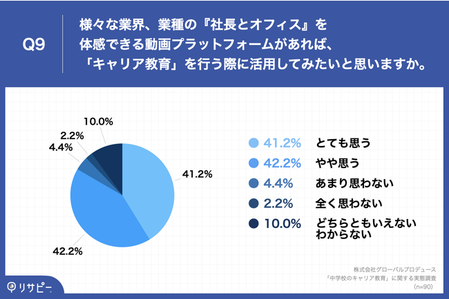 「Q9.Q5で「とても感じる」「やや感じる」と回答した方にお聞きします。様々な業界、業種の『社長とオフィス』を体感できる動画プラットフォームがあれば、「キャリア教育」を行う際に活用してみたいと思いますか。」(n=90)と質問したところ、「とても思う」が41.2%、「やや思う」が42.2%という回答となりました。