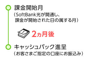他社では早くても6ヵ月、遅いと12ヵ月後のキャッシュバック進呈が多いのですが、当社では、課金開始月の翌々月末をめどに振込みいたします(例:課金開始月が1月なら3月末振込)。