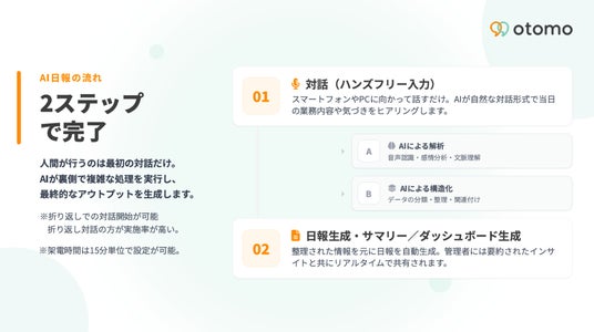 株式会社DeCoA(本社:東京都新宿区、代表取締役:吉松 誠二)は、独自開発の特許技術を活用し、電話の会話内容から日報を自動生成・構造化するAI日報ツール「otomo(オトモ)」をリリースいたしました。