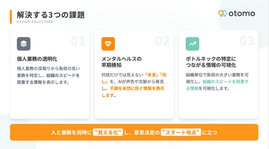 そこでotomoは日々の日報データを解析し可視化することで、「個人業務の透明化」「メンタルヘルスの早期検知」「ボトルネックにつながる情報の可視化」を実現します。