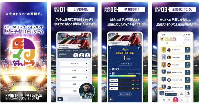 「なんドラ」はアプリケーションを利用し試合の勝敗や特定選手の活躍などを予想するサービスです。予想結果に応じてポイントを獲得でき、週間ランキング上位ユーザーには様々なギフトをプレゼントしており、全国にいる利用者とランキング勝負を通してスポーツ観戦に新たな観戦価値と熱狂を提供します。