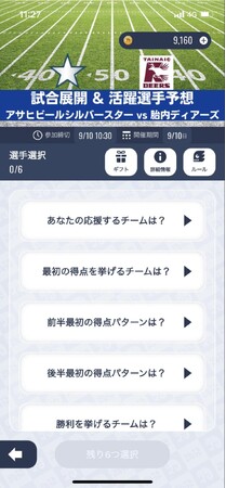 勝敗や試合展開、MVP選手の予想を選択し、獲得したポイントのランキングで競う