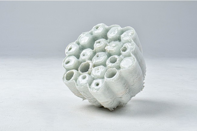 A-TOM ART AWARD 2021特別賞を受賞した冨井は、伝統的なガラス工芸技法を応用し、ガラスに土を混入させて陶器のような質感をもつ立体作品を制作する現代アーティストです。冨井の扱うガラス作品たちは、我々がガラスと聞いて想像する透き通った透明感と異なり、まるで陶器や鉱物のような質感をもち、繊細に富山の大自然と呼応し、光の反射の中で様々な深みや表情を見せます。