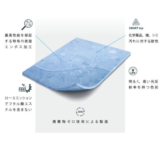 100%再生可能エネルギーで生産し、バックサンディングを行わずワンステップで製造することにより2mmあたり10~15%の廃棄物を削減しました。さらにこの廃棄物を他のビニル床材の裏打材に再利用することで実質廃棄物ゼロを実現しています。