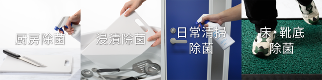 食品表面の除菌・洗浄から、厨房機器、身近な手が触れる場所の除菌まで、どこでも使用できます。