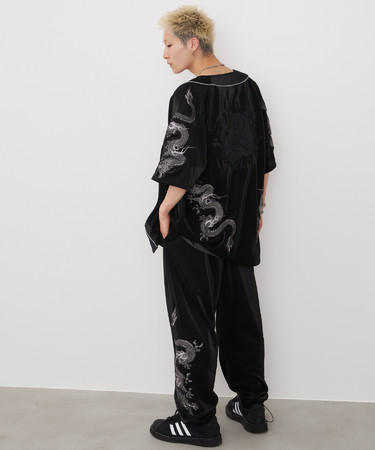 太もも下から裾に掛けてサイドに龍の刺繍を大きくデザインしたGALFY×AIVERコラボのジャージパンツ。