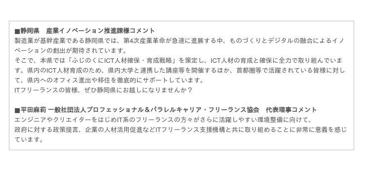 このたび協力会員募集の体制が整い、当機構の理念や取り組みにご賛同いただき、協力会員として静岡県ならびにフリーランス協会が加盟されました。今後も会員の皆様とも協力し、さらなるITフリーランス業界の健全化と活性化に取り組んでまいります。