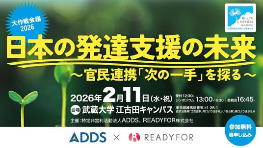 特定非営利活動法人ADDSおよびREADYFOR株式会社は、2026年2月11日(水・祝)、武蔵大学 江古田キャンパスにて、シンポジウム「大作戦会議2026 日本の発達支援の未来 ~官民連携『次の一手』を探る~」を開催します。