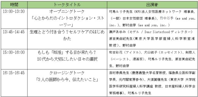 イベントでは、今多くの方が悩んでいる2大テーマ「月経」と「生殖」について、アーティストやタレントから医師まで多彩な話し手によるトークのほか、視聴者のお悩みに答えるようなインタラクティブな企画を予定。月経、生殖をメインテーマに、女性のからだ特有の悩みなど、自分のからだに向き合い、そこで得た知恵や知識を大切な人にも共有できるやさしく心強い循環を生まれる機会をつくります。