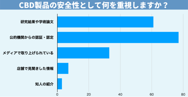 最後にCBD製品の安全性として何が重視されますか?という質問をしたところ、最も多かったのは「公的機関からの認証・認定」、次いで「研究結果や学術論文」という回答になりました。