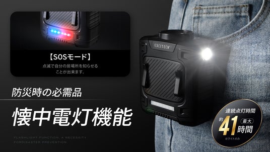 災害や停電時にも心強いモバイルバッテリー機能を搭載。スマートフォンなどへの給電が可能です。2段階切り替えができるライト機能も装備しており、ライト単独使用時には最大約41時間の連続点灯が可能。さらに、万が一の際には緊急警告灯としても使用でき、SOSサインを発信することができます。防災グッズとしても、1台持っておくと安心です。