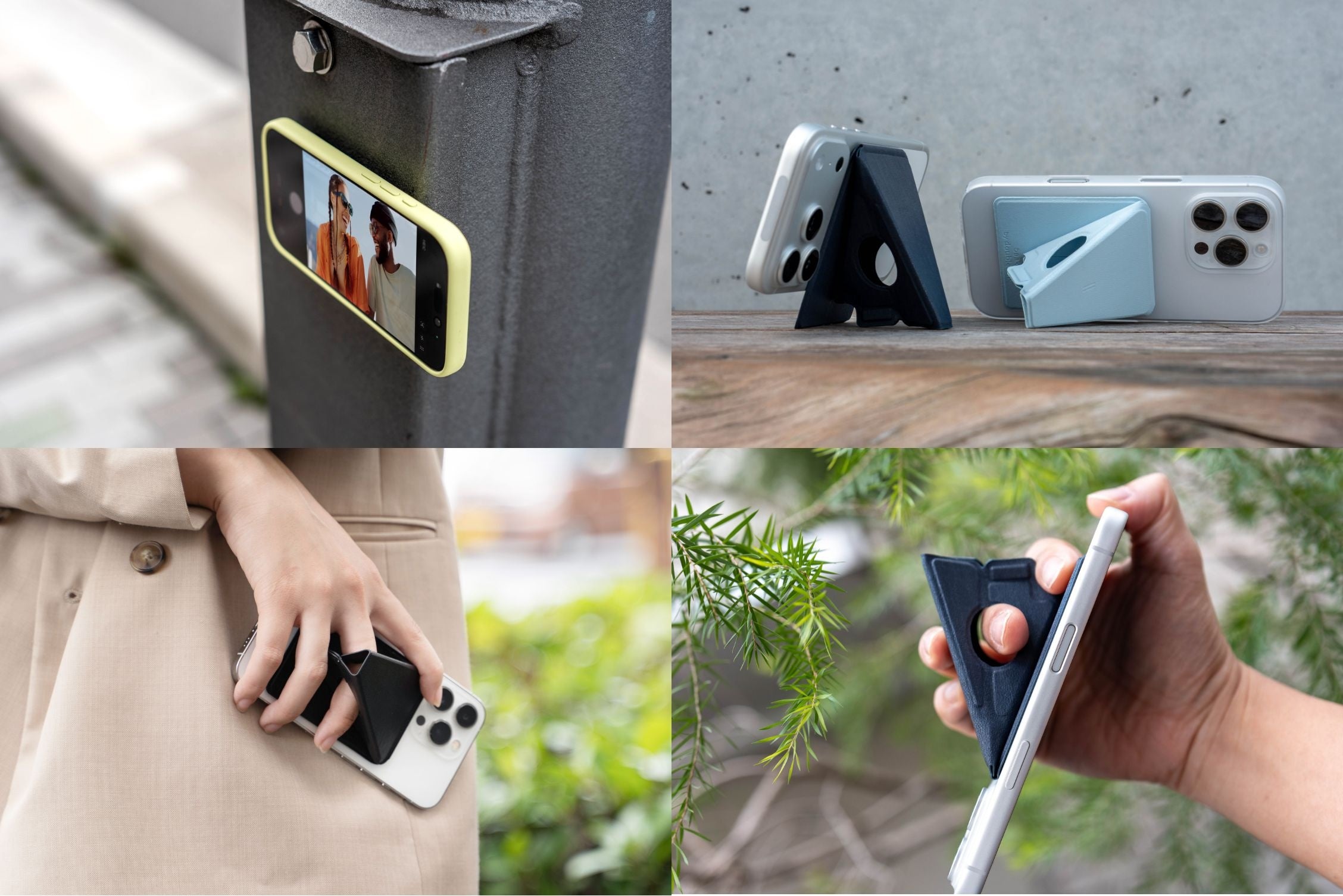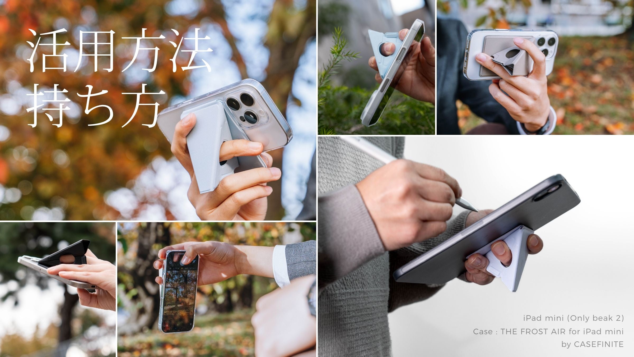 3-in-1 スマホアクセサリー:1. グリップ性能 2. 縦横で安定した自立 3.壁張りハンズフリー