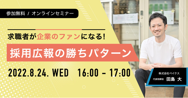 株式会社ペイクス(本社:東京都世田谷区、代表取締役:田島大、以下ペイクス)は、2022年8月24日(水)に無料オンラインセミナー「採用広報の勝ちパターン」を開催いたします。
