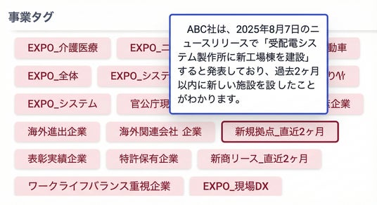Web上のニュース、プレスリリース、求人媒体、政府機関など、多岐にわたるデータソースをAIが常時モニタリング。「海外拠点設立」「新商品リリース」「サステナビリティ推進」など、企業の具体的なアクションを自動でタグ付けします。