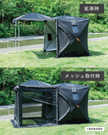 さらに付属の蚊帳を取り付ければ、広々とした奥行きのあるテントに。グランドシートを敷いたり、コット(アウトドアベッド)を置くことで、そのまま宿泊も可能です。