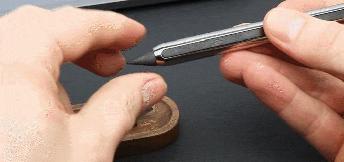 グラファイトチップは、黒鉛で筆記することができ、芯を研いでメンテナンスも可能。