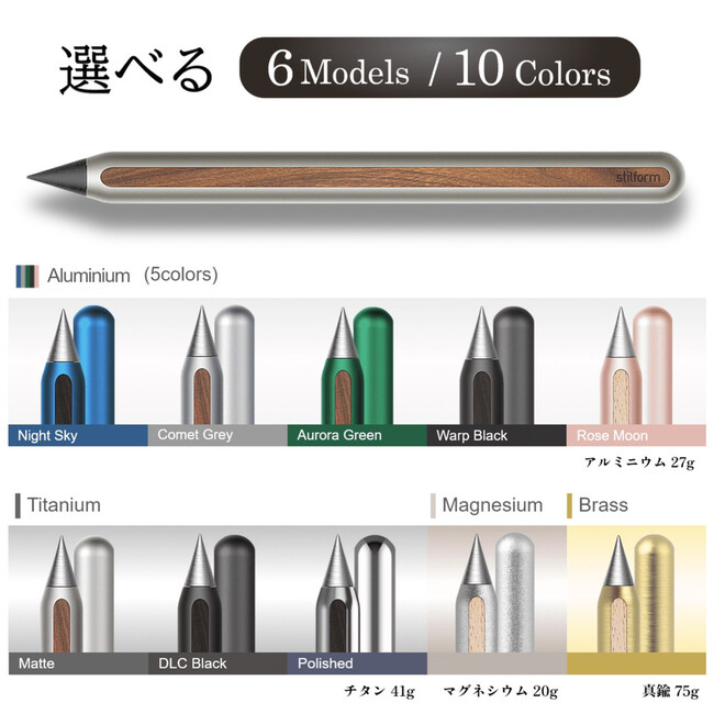 金属は、筆記具で一般的に使用されるアルミや真鍮のほか、チタン、マグネシウム、24金を採用。