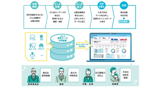 JMCは30年以上の間、教育専業のIT企業として、時代の潮流に合わせたサポートを現場に提供してまいりました。近年では、ICTを使ったわかりやすい授業カリキュラムの作成に関わる支援や、校務の効率化ツール、先生方に必要なデータの提供などを行っています。さらに、個人情報や要配慮個人情報などの漏洩リスクを排除するサービス、学びの空間デザインなど、教育にまつわるさまざまな面で教育の現場を支援させていただいています。