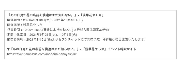 『あの日見た花の名前を僕達はまだ知らない。』ファンの皆様にお楽しみいただけるイベントを企画しておりますので、ご来園を心よりお待ちしております。