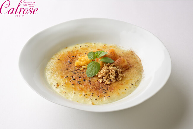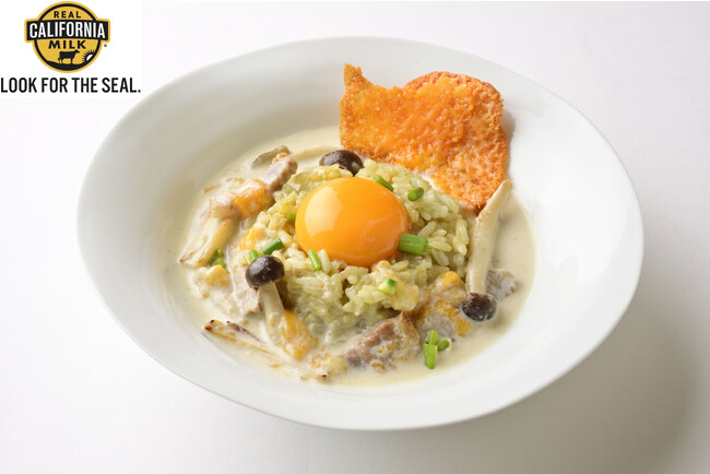 作品紹介:緑茶と出汁で炊いたカルローズに、ベーコン、しめじ、コルビージャックチーズ、牛乳、白だしで作った和風のカルボナーラスープを注ぎ、卵黄を崩しながら食べて、粒感のあるカルローズとさらさらとしたソースとの好相性を楽しむ一品。加熱したコルビージャックチーズも添えて二つの食感を演出。
