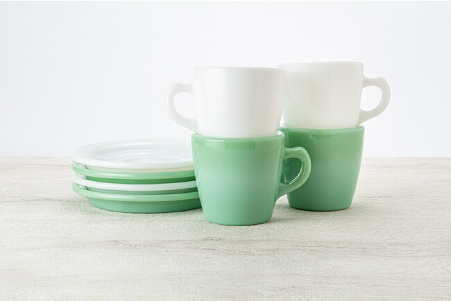The product line-up comes in two colors: Jade-ite and milk white, the same colors in the vintage Fire-King.