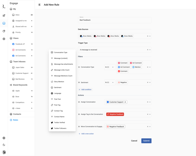 Statusbrewのルール・エンジンを使えば、指定した条件に基づいて会話を整理整頓、作業の優先順位をつけ、最初に対処すべき緊急事態があるかどうかを確認し、荒らしコメントやスパムを排除、すべての質問とメッセージに返信することが容易になります。