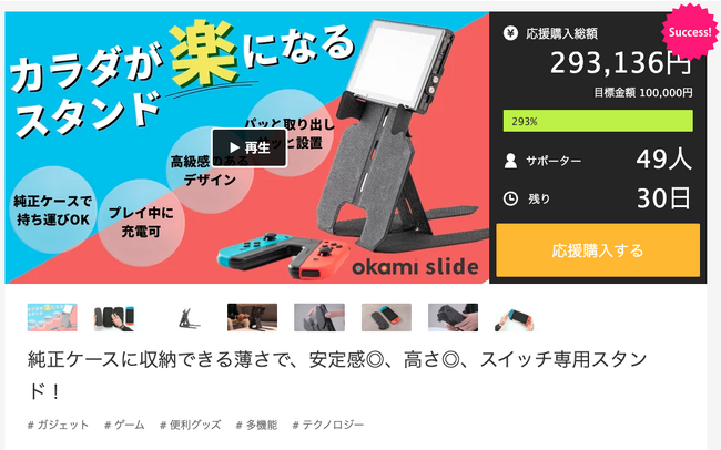 2023年6月29日(木)よりクラウドファンディングサイトMakuakeにて開始した、純正ケースに収納できる薄さで、安定感◎、高さ◎、スイッチ専用スタンド!【okami】プロジェクトが、目標金額の293%となる29万円超、49名のサポーターの皆様からご支援を頂きましたことをご報告致します。