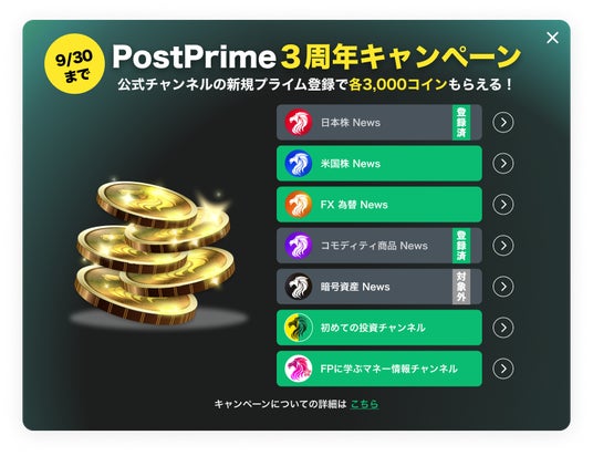 お金に関する様々な情報があつまるPostPrimeを運営するPostPrime株式会社(代表取締役社長 高橋ダニエル圭 本社:東京都港区虎ノ門)は3周年記念イベントとしてPostPrime公式チャンネル登録を対象としたコインプレゼントキャンペーンを実施いたします。
