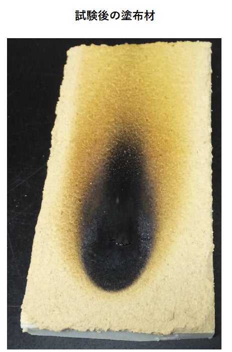 さらに、一般的な木粉の特長でもある、吸水性や消臭性、断熱性などもあわせもっているため、安全、健康、快適な住環境を実現できるサステナブルな建築資材と言えるでしょう。この不燃木粉の塗り材を発泡ウレタンに塗布し、乾燥させた試験材の燃焼試験を行い、合板の防炎基準に合格する難燃性能を確認しました。