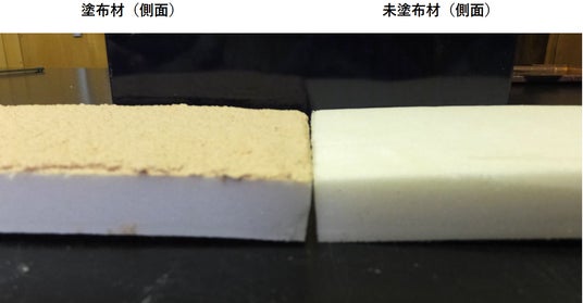 左:発泡ウレタン断熱材(硬質ウレタンボード)に不燃木粉を加工したサンプル 右:未処理の発泡ウレタン断熱材